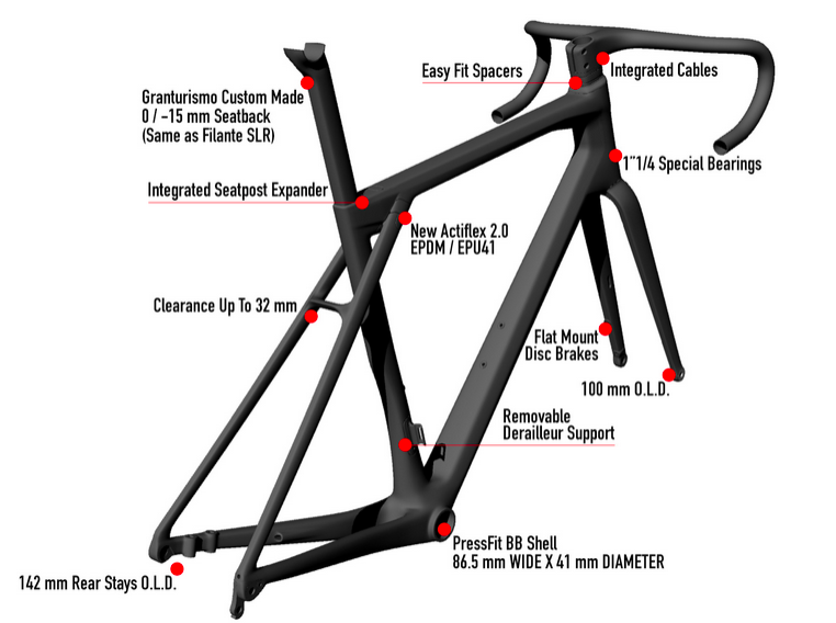 Actiflex 2.0 gives Granturismo SLR a smooth and comfortable ride. Torsional stiffness and responsiveness are guaranteed by numbers very close to those featured on other Wilier racing bikes, thanks to the bridge on the rear stays and the new positioning of Actiflex near to where the seat tube and top tube intersect.